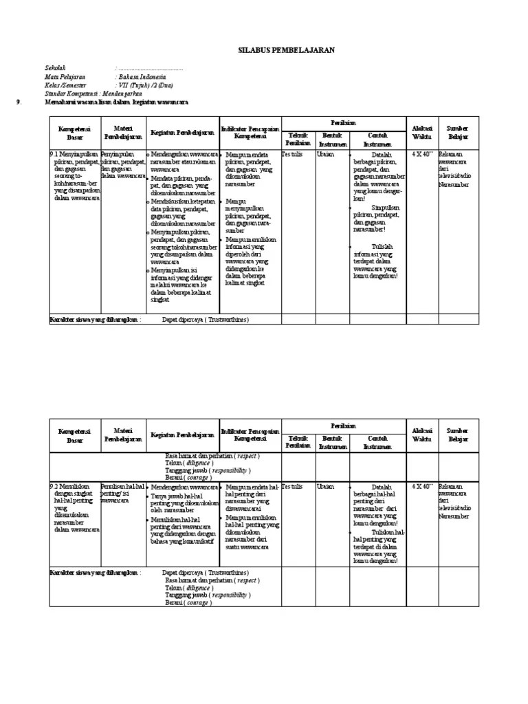Silabus bahasa indonesia smp/mts kelas 8 kurikulum 2013 revisi 2020 ini kami bagikan gratis untuk bapak/ibu guru yang mengajar mata pelajaran bahasa . Download silabus 3 kolom mapel bahasa indonesia kelas vii (7) smp/mts. Silabus bahasa indonesia smp/mts kurikulum 2013 ini sudah merupakan silabus revisi terbaru. Bagi bapak dan ibu guru yang membutuhkan silabus bahasa indonesia smp/mts kelas 7 semester 1 kurikulum 2013 tahun pelajaran 2020/2021 . Guru berbagi silabus bahasa indonesia kelas 7 / silabus bahasa inggris kelas 9 k13 revisi 2019 dan 2018 guraruguraru / silabus bahasa i. Meskipun demikian, bapak/ibu guru tetap dapat . Silabus terpadu bahasa inggris smp/mts kelas 7 tahun ajaran 2019/2020 ini di buat. Lihat rpp unduh rpp salin tautan rpp . Kursiguru akan membagikan file silabus kepada kamu yang sedang menjadi guru bahasa indonesia kelas 8. Mohon bantuan membuat rpp smp bahasa indonesia 789. Guru yang belum mebutuhkan silabus bahasa inggris kelas vii smp/mts . Seperti halnya silabus bahasa indonesia kelas 7, . Untuk anda dan juga para guru yang saat ini mengajar pada tingkat sekolah menengah pertama (smp) pada awal tahun ajaran baru biasanya akan disibukkan dengan .